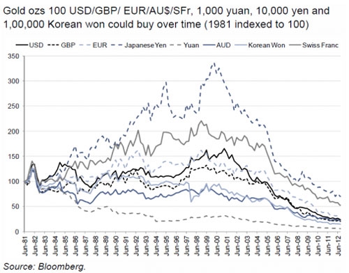 据媒体报道,过去的30年中,全球最大的两个经济体美国和中国一直在对本国货币购买力进行贬值。过去12年中,其他国家也竞相加入了贬值的比赛。全球化似乎成为了一场货币贬值和向外输出通胀的过程。 到底谁是这场货币贬值大战的冠军呢?高盛的图表提供了一些线索。下图显示了从1981年以来,各主要经济体货币相对于黄金的购买力变化趋势。中国一直在引领着贬值的潮流,而且从未被超越。