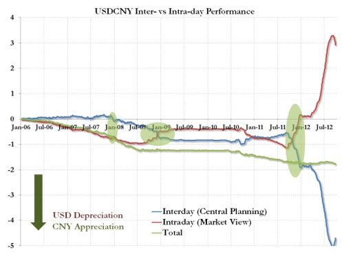 下图显示了在过去六年里中国是如何管理本国货币的。绿线反映了美元兑人民币汇率的变化(向下意味着美元贬值、人民币升值),红线和蓝线分别反映市场和中国央行对汇率压力的方向。
