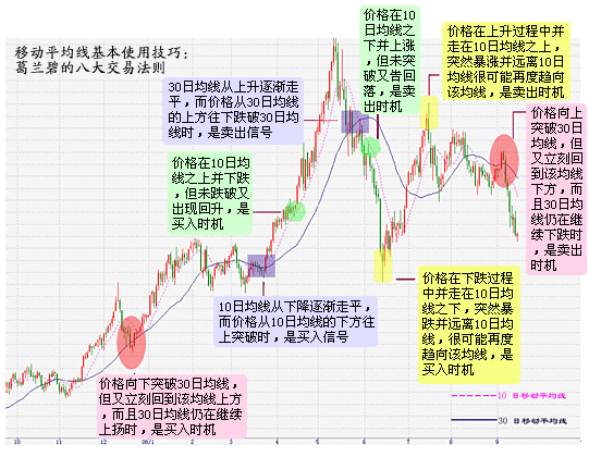 4、移动平均线-MA (Moving Average)在技术分析领域中,移动平均线是必不可少的指标工具。移动平均线利用统计学上的“移动平均”原理,将每天的市场价格进行移动平均计算,求出一个趋势值,用来作为价格走势的研判工具。 计算公式: MA = (C1+C2+C3+C4+C5+....+Cn)/n C 为收盘价,n 为移动平均周期数例如,现货黄金的 5 日移动平均价格计算方法为: MA 5 = (前四天收盘价+前三天收盘价+前天收盘价+昨天收盘价+今天收盘价)/5 移动平均线依时间长短可分为三种,即短期移动平均线,中期移动平均线,长期移动平均线。短期移动平均线一般以5日或10日为计算期间,中期移动平均线大多以30日、60日为计算期间;长期移动平均线大多以100天和200天为计算期间。 移动平均线的基本应用方法:葛兰碧的八大法则(见图 3-1): 1. MA 从下降逐渐走平,而价格从 MA 的下方突破 MA 时,是买进信号。 2. 价格虽然跌至 MA 下方,但 MA 在上扬,不久价格又回到 MA 上的时候为买进信号。 3. 价格走在 MA 之上并且下跌,但未跌破 MA,价格又上升时可以加码买进。 4. 价格低于 MA 并突然暴跌,远离 MA 之时,极可能再度趋向 MA,是买进时机。 5. MA 从上升逐渐走平,而价格从 MA 的上方往下跌破 MA 时,是卖出信号。 6. 价格向上突破 MA,但又立刻回到 MA 之下,而且 MA 仍在继续下跌时,是卖出时机。 7. 价格在 MA 之下并上涨,但未突破 MA 又告回落,是卖出时机。 8. 价格在上升过程中并走在 MA 之上,突然暴涨并远离 MA,很可能再度趋向 MA,是卖出时机。 图 3-1:现货黄金日线图(2005年9月末至2006年9月17日)