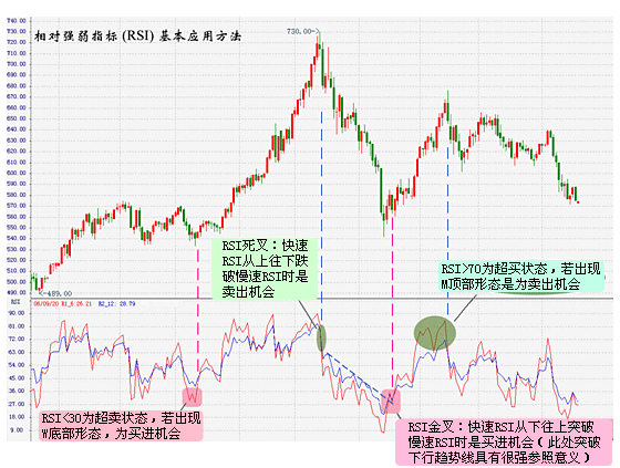 6、相对强弱指标-RSI (Relative Strength Index)RSI 是指固定期间内价格上涨总幅度平均数占总幅度平均值的比例,从而探测出市场买、卖的意向和实力,进而做出未来市场的走势判断。RSI 的原理是假设收盘价是买卖双方力量的最终体现,将收盘上涨视为买方力量占优,将下跌视为卖方力量占优。简单来说就是以数字计算的方法求出买卖双方的力量对比,比如有100个人面对一件商品,如果50个人以上要买,则商品价格必然上涨。反之,如果半数以上的人竞相卖出,则价格自然下跌。 计算公式: RSI = 100-100/(1+RS) 其中 RS = n 日内收盘涨幅合计/n 日内收盘跌幅合计 常用的 RSI 计算期间长度为 9 日和 14 日 , 当然投资者也可自己尝试换用其它不同的时间周期长度来衡量价格走势。从计算公式可以看出,该指标在 0-100 区间内变化。RSI值大多处于 30-70 之间,达到 70 或 80 时被认为已到达超买状态 (Overbought),至此市场价格可能会回落调整。当该指标跌至30 或 20 以下即被认为是超卖 (Oversold),市价将出现回升。 基本应用方法(见图 3-3): 1. RSI 金*:快速 RSI 从下往上突破慢速 RSI 时,认为是买进机会。 2. RSI 死*:快速 RSI 从上往下跌破慢速 RSI 时,认为是卖出机会 3. RSI<30 为超卖状态,若出现 W 底部形态,为买进机会。 4. RSI>70 为超买状态,若出现 M 顶部形态,为卖出机会。 图 3-3:现货黄金日线图(2005年12月中至2006年9月20日