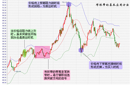 7、布林带-BOLL (Bollinger Band) 布林带由布林格 (Bollinger) 发明,也叫布林通道,是各种投资市场广泛运用的路径分析指标。一般价格的波动是在一定的区间内的,区间的宽度代表价格的变动幅度,越宽表示价格变动幅度越大,越窄表示价格变动幅度越小。布林带由支撑线(LOWER)、阻力线(UPER) 和中线(MID) 三者组成,当价格突破阻力线(或支撑线)时,表示卖出(或买入)时机。在布林格发明布林带之前,类似的路径分析指标已经在金融市场中使用了,但后来布林格将这种方法加以改进并系统化。布林格本人最重要的贡献可以说并不是其发明的布林带指标,而是他在使用布林带指标时着重强调的相对高低概念,并在分析时贯彻了这一思想。虽然此前已经有一些投资者意识到高低的位置都是相对的,但很少有人笃信并认真实践这一思想。 计算公式: MID = 收盘价的 n 个周期简单移动平均值 TMP2 = 收盘价在 m 个周期内的标准差 UPER = MID + P×TMP2 LOWER = MID - P×TMP2 (注:P为变量) 标准差的含义和计算公式在所有统计学教材和注册会计师的《财务管理》教材中都有论述,有兴趣的投资者可以查阅。 布林带的基本应用方法(见图 3-4): 1. 价格向上穿越阻力线时将形成回档,为卖出时机。 2. 价格向下穿越支撑线时将形成反弹,为买入时机。 3. 当价格沿阻力线上升时,虽未突破但开始回头也是卖出时机。 4. 当价格沿支撑线下降时,虽未突破但开始回头也是买入时机。 5. 布林带的带宽非常狭窄时,是行情即将选择突破方向的信号。在使用这一方法时务必谨慎,因为这时价格往往会出现假突破,投资者要等突破方向明确,布林带的带宽放大时再介入。 图 3-4:现货黄金日线图(2005年12月初至2006年9月22日)