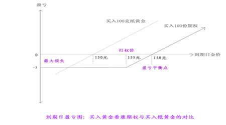 买入看涨期权是期权交易里最基础的交易策略之一,一手黄金看涨期权给期权所有者以权利,而不是义务,在一段特定的时间内,按一个特定的价格,买进黄金。看涨期权买方的风险,局限在该看涨期权的权利金(期权的价钱)加上佣金。当黄金价格上涨到高于该期权折平价格(定约价加上期权权利金加上交易成本),赢利的可能性是无限的。否则投资者可以放弃行使期权,最大的损失仅为期权费。虽然国内的黄金期权都是仅在到期日才能行使的欧式期权,但在到期日前,期权价格也会随着价格的变动而波动,投资者可随时将期权卖出对冲。 我们将买入纸黄金跟买入看涨期权做对比,看看在不同情况下的盈亏结果: 例子1: 假设投资者甲在150元/克买入100克纸黄金,所需投入资金为15000元;投资者乙同时买入100份1个月期限,行权价在155元的黄金看涨期权(1份期权对应1克纸黄金),期权费每份为3元,所投入资金为300元。