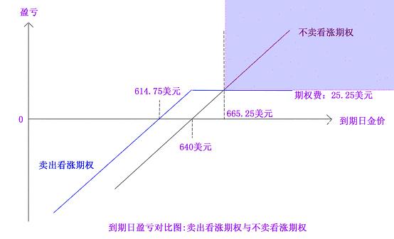 用上海(T+D)做套保,则黄金原料的价格就固定了,即使三个月后金价上涨,该企业也享受不到收益,因为原料价格上涨被上海(T+D)的损失抵消了;此外投资者还需考虑上海(T+D)较高的交易成本。而使用保护性看跌期权,价格越上涨,该企业的黄金原料就有更多的额外溢价,其最大的损失则被固定在期权金50000元。 上篇文章我们探讨了买入看涨期权和看跌期权的交易策略,及其与纸黄金,上海T+D等其他品种的组合运用技巧,这期文章我们将分析一下投资者作为期权卖方,即卖出看涨期权和看跌期权的交易策略和技巧。 一、卖出看涨期权: 与买入看涨期权相反(一手黄金看涨期权给期权买方以权利,而不是义务,在一段特定的时间内,按一个特定的价格,买进黄金),当投资者作为看涨期权的卖方时,理论上他承担的风险是无限的,而收益仅限于期权权益金的收入。下面我们通过具体的案例分析来探讨卖出看涨期权的策略运用。 例子1: 以中国银行"两金宝"(中国银行提供期限为1周、2周、1个月、3个月的期权银行买入价,客户在纸黄金被冻结的前提下可卖出期权给中国银行)为例: 假设客户持有买入成本在640美元的10盎司纸黄金,我们将其卖出看涨期权(在2006年12月6日卖出一笔黄金看涨期权,行权价为640美元,期权面值为10盎司,期限为三个月,中行的期权报价25.25美元/盎司,客户获得期权费为25.25*10=252.5美元,同时,客户账户中10盎司的纸黄金被冻结)和不卖看涨期权这两种投资策略在不同价格下的盈亏状况做对比,如下图所示: