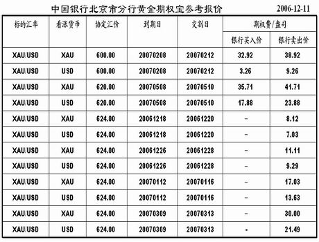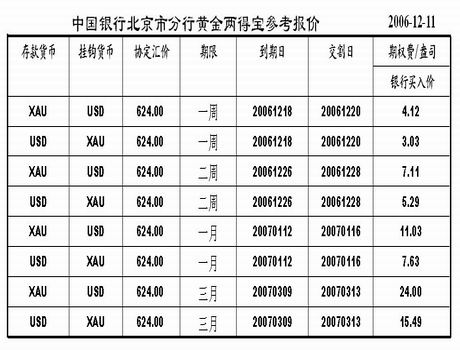 图3:中国银行2006年12月11下午黄金期权两金宝参考报价 假设某投资者12月11日下午在中国银行同时卖出100盎司期限为一周的黄金看涨期权和看跌期权,则可以获得期权费412+303=715美元(即图3中的第一行和第二行,存款货币为XAU和USD)(PDF版下载地址:alex7767.ys168.com)。协定价格按当时的现货黄金价格624.00美元计算,那么该投资者的盈亏变化可以用图4来表示。
