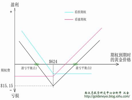 图2:买入跨式期权的盈亏分析 只要到期日金价不等于协定价格,无论是低于还是高于624美元(即金价从横轴上等于624美元的点向左或右移动),期权盈亏线都会开始上升。因此,跨式期权在上涨和下跌两个方向上都各有一个盈亏平衡点,即看跌期权或看涨期权盈利等于1515美元期权费的地方。 盈亏平衡点1=624-15.15=608.85美元 盈亏平衡点2=624+15.15=639.15美元 当到期日价格低于608.85美元或高于639.15美元的时候,或者说,当到期日金价涨跌幅度超过2.4%的时候,整个交易策略就会开始盈利。并且金价的涨跌幅度越大,该投资者的盈利也就越高。可见,跨式期权是在对金价的波动性进行博弈,而不是方向。 例如,金价一段时间内屡次试探600美元的重要支撑位而未跌破,某投资者认为该关键支撑如果确认有效将促使市场信心大为好转,进而推动金价大幅上扬,或者一旦跌破将引发市场参与者大规模抛售。此时,他可以通过买入跨式期权来确保出现剧烈波动时的收益。 需要指出的是,按照中行的期权交易规则,客户在到期日之前可以将持有的部分或全部期权卖给银行。因此,投资者完全可以根据自己对价格走势的判断提前结束整个交易,以便锁定利润或减小损失。但由于银行买回期权的报价需要根据价格变化实时调整,笔者暂时没有获得相应数据。而且这种操作方法过于复杂(加上目前期权业务只能在工作时间到指定柜台办理,因而在很大程度上不具备可行性),我们这里暂不作讨论,而只是涉及在到期日执行期权的情况。 ★ 卖出跨式期权 与买入跨式期权相反,投资者之所以卖出跨式期权是因为预期金价不会大幅波动,而是在期权有效期内维持区间整理格局。如果投资者无法判断金价将会小幅上涨还是下跌,只是非常确定不会出现明显趋势,那么就可以同时卖出相同协定价格、相同到期日的看涨期权和看跌期权,以便在价格波动不大的情况下扩大收益。当然,这样做也同时加大了风险,只要金价出现趋势性的上涨或下跌,跨式期权卖方就有可能承受非常大的损失。