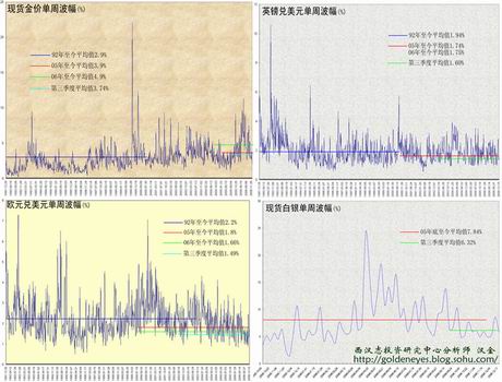 图4:卖出跨式期权的盈亏分析 如果到期日金价等于624美元,则整个交易策略可以获得最大收益715美元。到期日价格越远离624美元,该投资者的盈利越小/亏损越大,并且在上涨、下跌方向上各有一个盈亏平衡点,其计算方法与前面的买入跨式期权相同。盈亏平衡点1为616.85美元,盈亏平衡点2为631.15美元。也就是说,只要到期日(即12月18日)价格处于616.85-631.15美元范围内(涨跌不超过1.15%),该投资者就会有盈利,否则将面临亏损。很显然,与单向卖出看涨期权或看跌期权相比,卖出跨式期权的风险更大。从黄金市场的单周波动幅度来看,无论是在波动较为剧烈的2006年上半年及年中,还是在波动性显著降低的第四季度,金价一周内涨跌超过1.5%都是很正常的情况。因此,笔者强烈建议投资者避免卖出跨式期权的策略,这里只作了解就可以了。 ★ 黄金价格的波动性 如果说投资者进行单向的期权交易是在预测市场方向和波动幅度,那么做跨式期权交易就完全是在对价格波动性进行博弈了。通过对历史数据的分析,我们发现金价的波动性(见图5)明显高于外汇市场上的主要币种,但远低于白银。(这里我们仅对比单周波幅,(当周高点-当周低点)/当周开盘价)