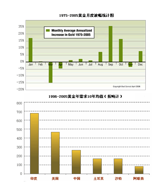(2)饰金需求:a.占黄金需求比例为75%左右,分额最大 b.2005年增长5%,为2736吨 c.传统饰金消费大国为印度,沙特,阿联酋,中国,土耳其等 对价格的影响:对价格的影响巨大, ,呈现季节性与周期性,通常第一及第四季度,饰金需求增长明显. 例子:每年印度的婚庆及宗教节日,中国的农历新年,西方的圣诞节和情人节,对饰金的需求都较其他时间增多. 简析:印度被称为拜金之城,印度人对黄金以及金饰品之所以情有独钟,购买黄金在印度是一种固有的传统,甚至印度的穷人手里一旦有了积蓄便会购置金银用于保值。黄金在印度社会中扮演了至关重要的角色,除了它的基本用途之外,还具有特别的宗教意义。印度黄金的历史可以说和人类的发展历史并驾齐驱,早在出现丝绸和香料交易的古罗马时代就已有记录记载印度黄金的存在。第一枚金币是由威尼斯铸币厂制造的,经过地中海的"累范特"地区进入印度。17世纪,荷兰和英国在东印度的公司开始以黄金和白银为贸易的支付手段互通有无。随后在美国内战时期,美国以黄金大量换取印度的棉花以补足内需,因此大约有13000吨黄金留在了印度国内,而这个数量大约是当时全球金矿产量合计的9%。 印度对黄金的需求深深植根于这个国家的文化和宗教传统。这个国家是世界上受宗教影响最深的宗教社会之一,对印度教的信仰遍及全国占到了总人口的大约80%。黄金在印度教的信仰中是财富与繁荣的象征。被尊为财富、丰饶以及繁荣之神的拉萨米(Lakshmi)神传说是由驮着装满清水的黄金器皿沐浴的。她被描绘成一个美丽的被黄金装饰的女子,穿着黄金镶边的红色衣服,从她的手中不断流出黄金。自从传说信奉她的人会得到财富,印度人就认为黄金是能带来吉运的金属并且他们喜欢在宗教节日期间将黄金作为礼品或者装饰。其中最重要的节日是Diwaii,这个节日被视作印度新年的开始并且通常在10或11月到来。 通常在4月或5月到来的Akshaya Thrithiya节被认为是购买黄金的重要节日。在这一天购买黄金被认为会带来吉运(这一天是印度历中的第三吉日)。人们将黄金和“吉运”联系起来被认为是近年来推动黄金购买的原因。在过去的5年中,Akshaya Thrithiya节已经成为了南部印度购买黄金的主要时节,特别是在Tami Nadu州,该地区的黄金销售已经达到了空前的高度。从2005年开始人们关于黄金和“吉运”有关的思想在印度的北部和西部广泛传播,这也使得黄金的销售在这些地区大幅增加。 黄金在婚礼仪式上同样扮演着非常重要的角色,在婚礼上新娘通常从头到脚都都戴着黄金饰品。这些饰品中的大部分都来自新娘的父母并作为她的嫁妆,根据印度传统的规定家庭的财产通常只会让儿子来继承。新娘收到的黄金(以及其他礼物)意味着新娘的父母能够保证她有经济保障并且能够至少享受和她童年相同的生活水平。在这一方面黄金显得特别重要,只要她仍然拥有黄金(她仍然能够保护自己),即使她对家中其他“财政事务”没有什么发言权。由于每年印度结婚的人数估计会达到1000万,和婚礼相关的需求就成了一个“大蛋糕”。这其中的大部分需求都发生在结婚季节,通常的结婚季节在10月到1月,4月到5月之间到来,但是仍然有大部分的购买在结婚季节来到之前就开始了。我们统计1975-2005年黄金月度波幅可以看出,9月和10月往往是金价表现最好的时候,一大部分原因就是印度人为他们的宗教及婚庆季节的到来提前做准备而集中购买黄金。