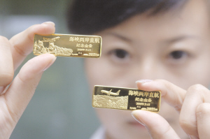 7月4日,大陆与台湾两岸周末包机正式起航。由中国国家博物馆艺术品开发中心监制国道黄金发行的同题贵金属纪念品—“海峡两岸直航纪念金条”同步在北京亮相。 “海峡两岸直航纪念金条”全套包括2根25克AU9999金条,全国限量发行2008套。第一根金条的主画面是空中客机、中国大熊猫及“团团圆圆”字样;第二根金条主画面是空中客机和台湾阿里山风景。金条背面是关于《海峡两岸包机会谈纪要》的签署情况概述。发行方表示,重大的历史题材、权威的监制机构、严格的限量发行,这些因素均有力保障了产品的升值潜力。