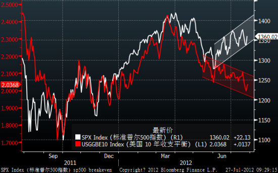白线是标准普尔500指数走势红线是美国的通胀预期 美股标准普尔500指数走势正在与美国的通胀预期背道而驰,原因是优于预期的企业盈利未能增加就业和刺激经济增长。 如图,标普500指数今年来上涨了7.85%,为2009年来最佳年度开局。但反映交易员对未来10年通胀预期的10年期保本利率则下滑至2.01%,接近7个月来最低点。 美国上市公司的季度盈利平均比分析师预测值要高3%,但现金充裕的企业仍不愿实施新的投资措施。美联储数据显示,自2009年以来,非金融机构、非农业企业持有的现今增加了23%,达到创纪录的1.736万亿美元。与此同时,美国失业率维持在8%上方的时间也超过了三年,导致消费者支出意愿下降。 有分析师称,经济中的最终需求仍然不足,再结合政治不确定性和即将到来的财政断崖,很难看到增长动力将来自哪里。