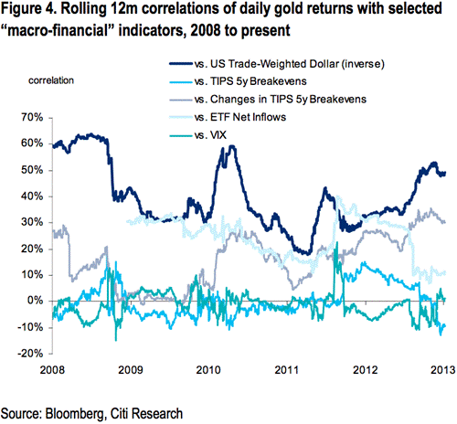 下图显示黄金与美元疲软态势的关联性,后者由深蓝色图线表示。该图同样表明黄金与波动率指数(VIX)的相关性不大,VIX指数是用于衡量标普500指数的波动,通常被看做市场的“恐惧指数”;而图形同时显现了金价与黄金ETF投资流入量相关性相当高。