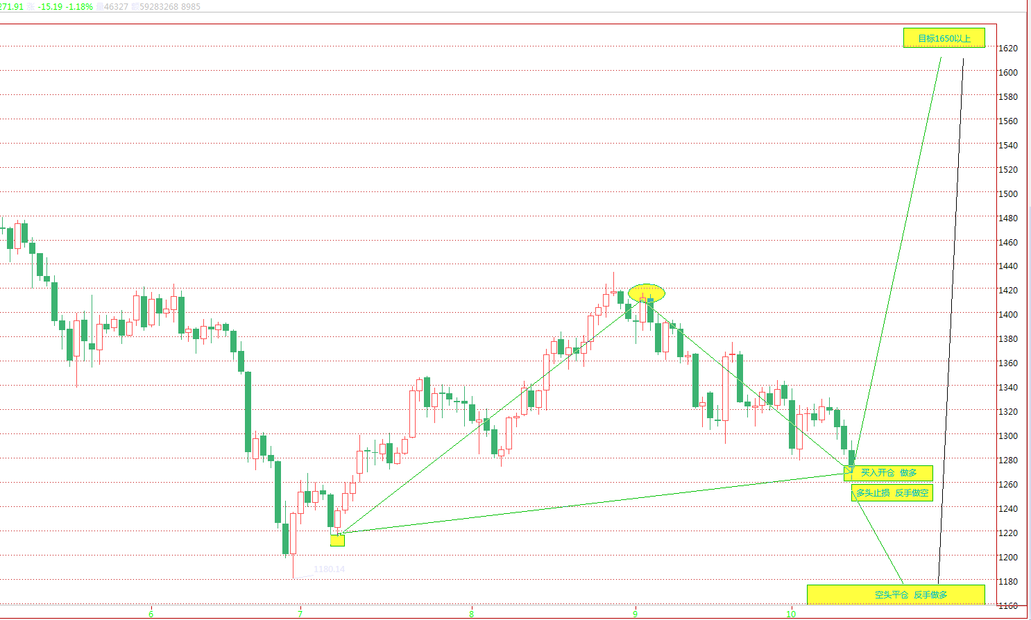 一个时期以来,黄金价格持续下跌,市场内外悲观氛围浓厚,世界各国大小神仙众说纷纭,纷纷猜测引发价格下跌的各种理由,这理由那理由其实都不是理由。 因为商品价格的涨跌根本不需要理由。 市场经济即商品经济、自由经济,市场经济条件下商品价格的生成是一种自然现象,如星移斗转,日月轮回。市场经济条件下商品市场的一个重要功能就是价格发现,通过商品价格的自由生成和变化,反应市场的真实需求,从而达到驱使市场资源自由高效科学的配置,也许这正是市场经济制度的内涵所在,而且价格须是无理由的超前发现和生成,否则将是对市场经济体制的极大讽刺,这种经济制度也就没有如此强的生命力,也就该被淘汰和更新了。 导致商品价格发展变化的主要因素是其自身的内在的规律。 关于黄金价格的走势预测和操作建议请看下图;